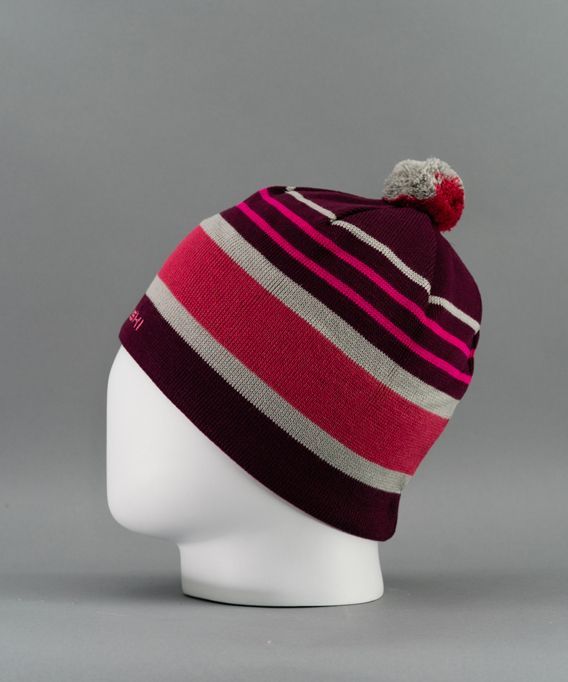 Дизайн с поперечными цветными полосами. Небольшой помпон сделан в цветах шапки. Фирменный логотип выполнен в форме вышивки. Модель представлена в едином размере, который подходит взрослым и подросткам.